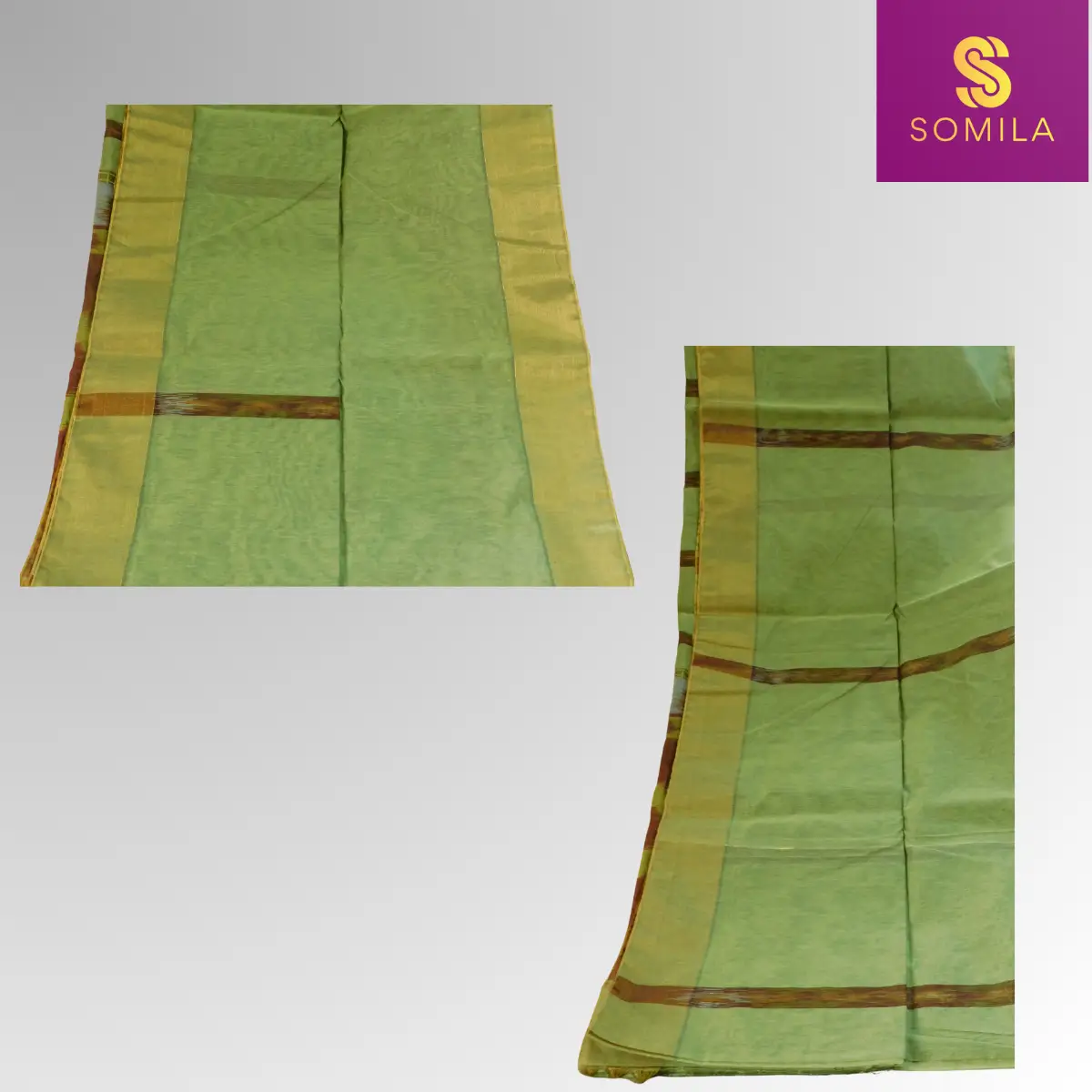 | The Finer Details | This saree is crafted from lightweight and breathable cotton, making it extremely comfortable for long hours. The body is a serene light green with simple gold borders, while the pallu comes alive with a bold, abstract Ikat pattern in earthy tones. The saree is finished with playful black tassels for a contemporary touch. | |